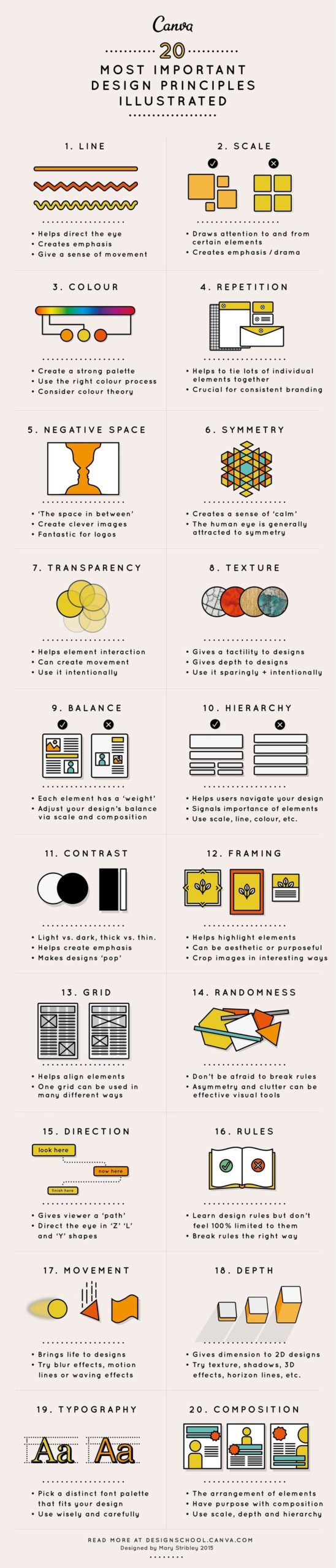 To make these concepts easy to grasp, Canva created a stunning infographic that breaks down the 20 most important design principles—from line, scale, and color to hierarchy, contrast, and movement. Each principle is paired with simple illustrations that explain how these elements influence composition and visual impact.